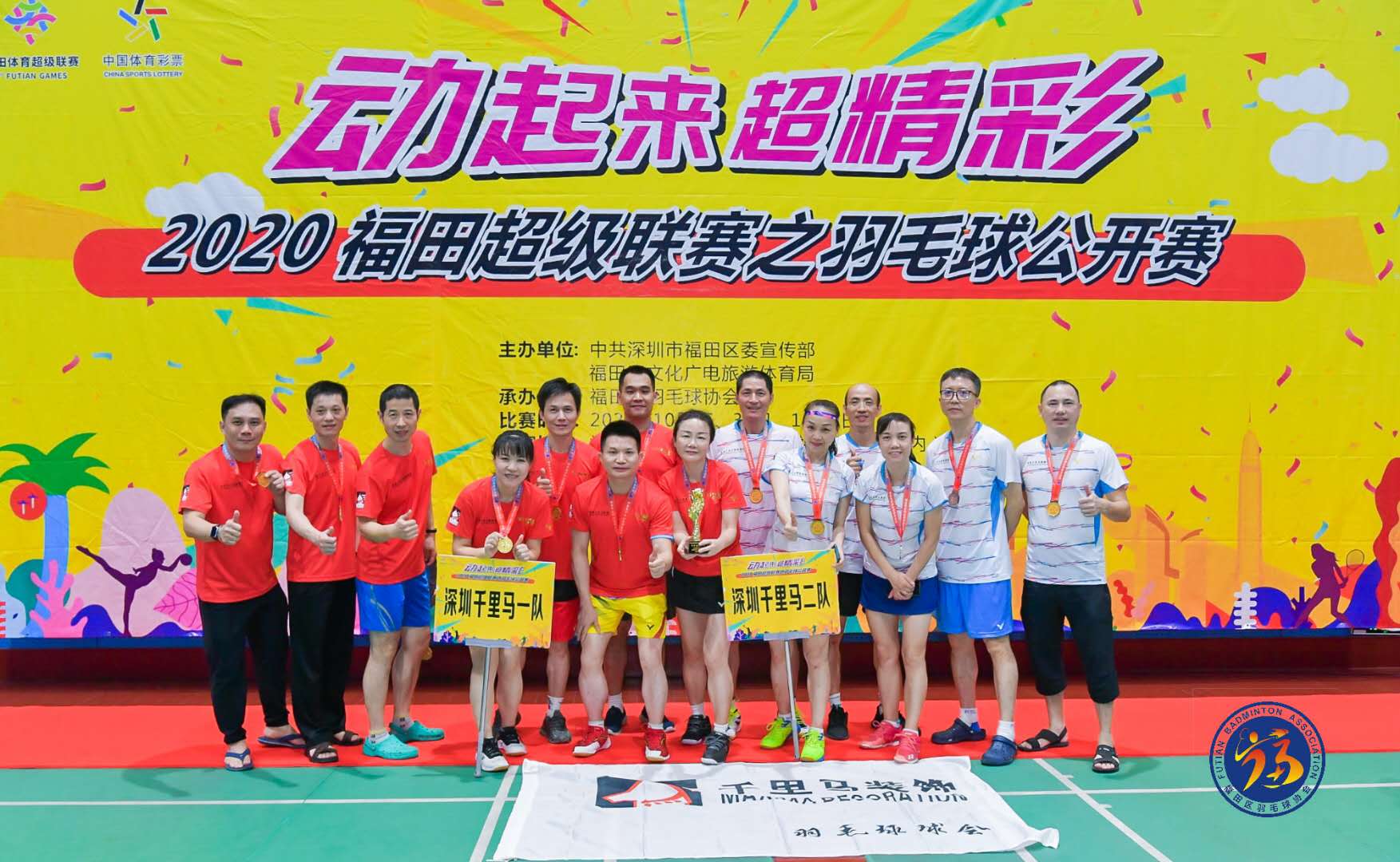 9月19日上午,2021福田超級聯賽之羽毛球公開賽在福田區委羽毛球館開打。本次比賽由中共福田區委宣傳部、福田區文化廣電旅游體育局主辦,福田區羽毛球協會承辦。比賽執行中國羽毛球協會審定的最新2020版羽毛球競賽規則。但在合法發球的判罰上不使用固定高度發球規則。本次比賽吸引深圳市48支隊伍共432名運動員報名參加,參賽隊伍來自全區多個企事業單位、俱樂部、社區、社團等。     比賽分為業余青年組、業余中年組兩個組別,均進行混合團體賽。業余青年組混團賽共有比賽項目設置3項,分別為第一男子雙打、女子雙打、第二男子雙打;業余中年組混團賽同樣進行3場比拼,項目設置分別為第一混合雙打、男子雙打、第二混合雙打。業余青年組于9月19日完成所有比賽,決出冠軍。業余中年組的比賽于9月20日進行,并在當日決出冠亞軍。   男子雙打賽中,李向東董事長殺球得分,擴大球隊奪冠優勢。     千里馬羽毛球球會在李向東董事長的親自指揮、帶領下,通過精心的備戰、科學的人員安排,以高超的競技水平一路過關斬將,最終包攬青年組、中年組冠軍,一騎絕塵。   千里馬羽毛球球會中年組奪冠合影     千里馬羽毛球球會青年組奪冠合影