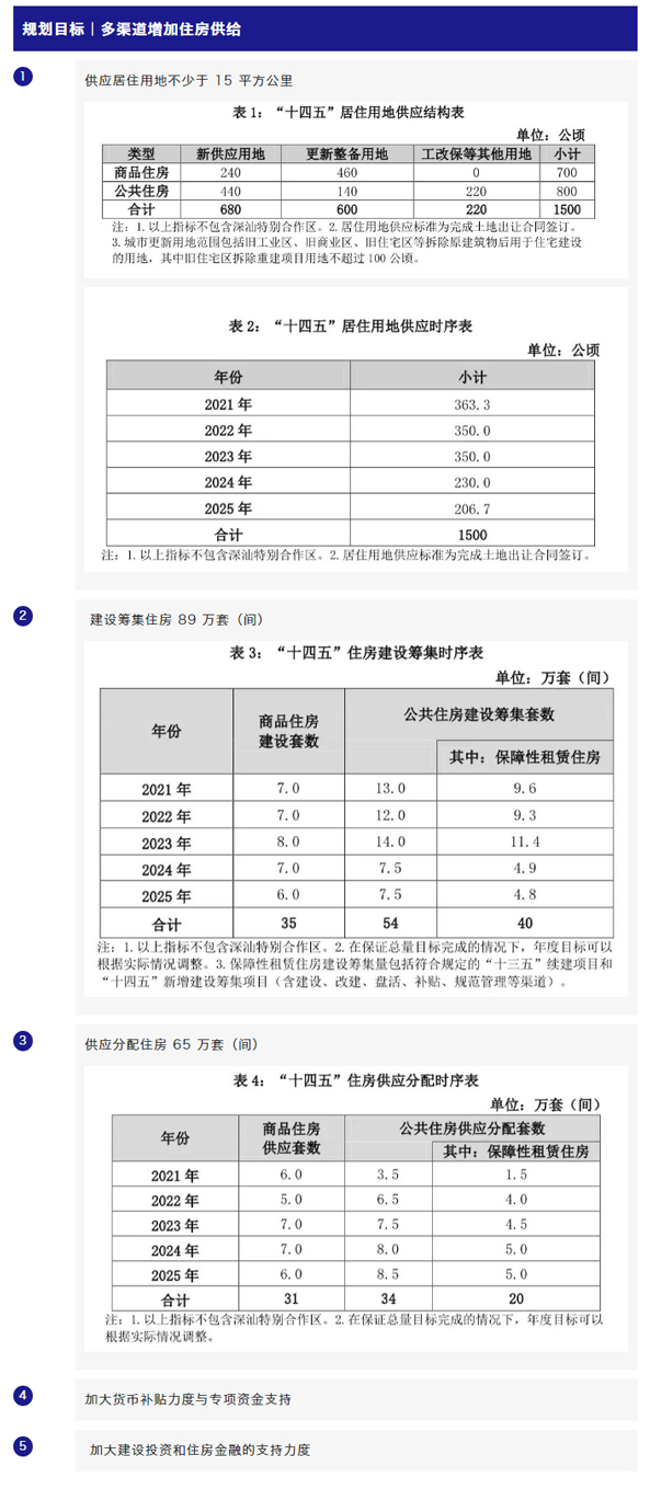 深圳市住房發展“十四五”規劃以供給側結構性改革為主線,以共生發展、共筑未來為思路,制定“?;?、廣覆蓋、促宜居”住房總體發展目標,明確供應居住用地不少于15 平方公里、建設籌集住房 89 萬套(間)、供應分配住房65 萬套(間)等具體指標,提出完善住房政策法規體系、加快發展保障性租賃住房、落實房地產市場健康發展長效機制、推進物業服務高質量發展、推廣綠色低碳宜居建筑等一系列發展策略,實現更高質量、更加公平、更可持續、更為安全的住房發展,不斷提升居住水平,逐步從住有所居向住有宜居邁進。
