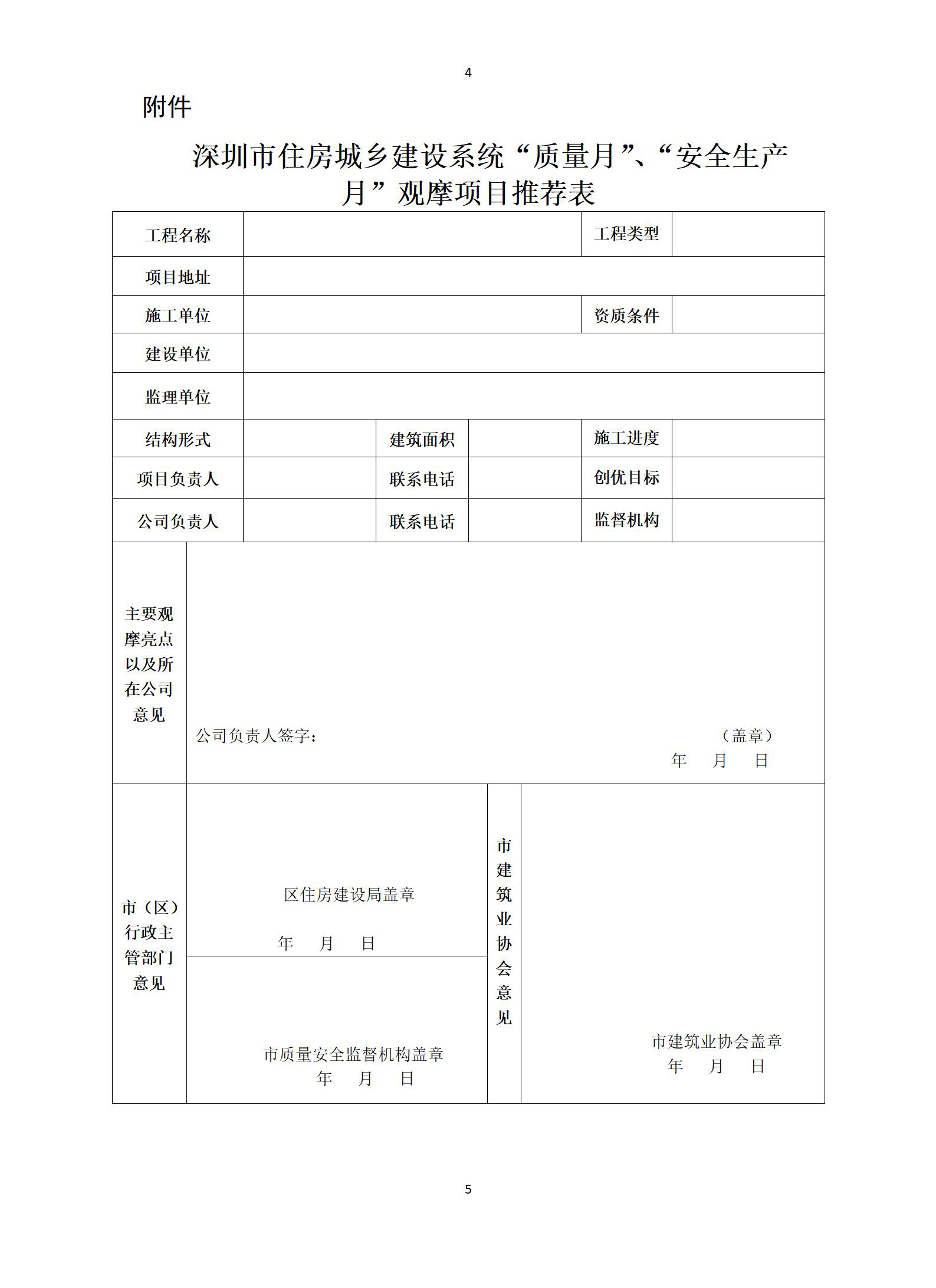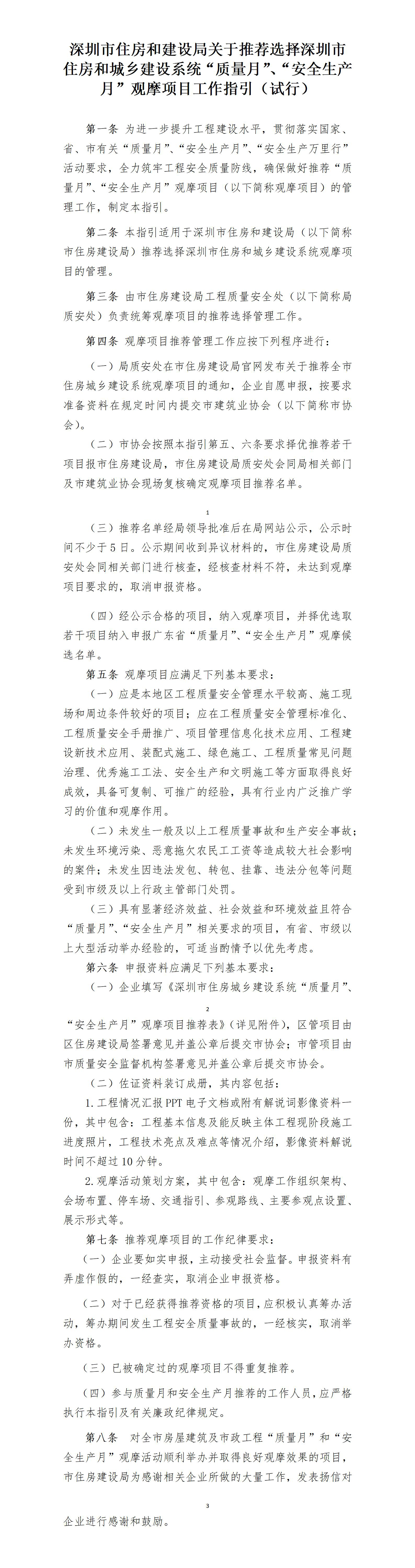 深圳市住房和建設局印發(fā)關于推薦住房和城鄉(xiāng)建設系統(tǒng)“質量月”“安全生產月”觀摩項目工作指引(試行)的通知