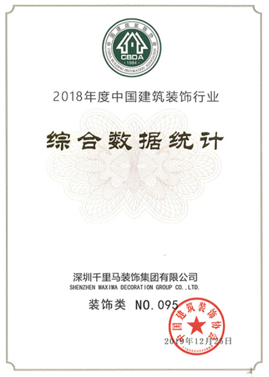 2019年12月24日,中國建筑裝飾協(xié)會(huì)揭曉了2018年度中國建筑裝飾行業(yè)數(shù)據(jù)綜合統(tǒng)計(jì)結(jié)果,深圳千里馬裝飾集團(tuán)榮獲裝飾百強(qiáng)第95名。