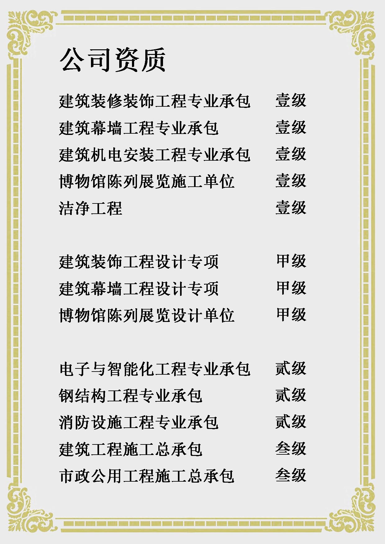 建筑總包三級、市政總包三級、鋼結構二級、智能化二級、消防二級