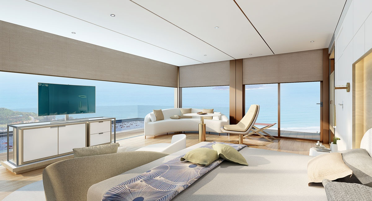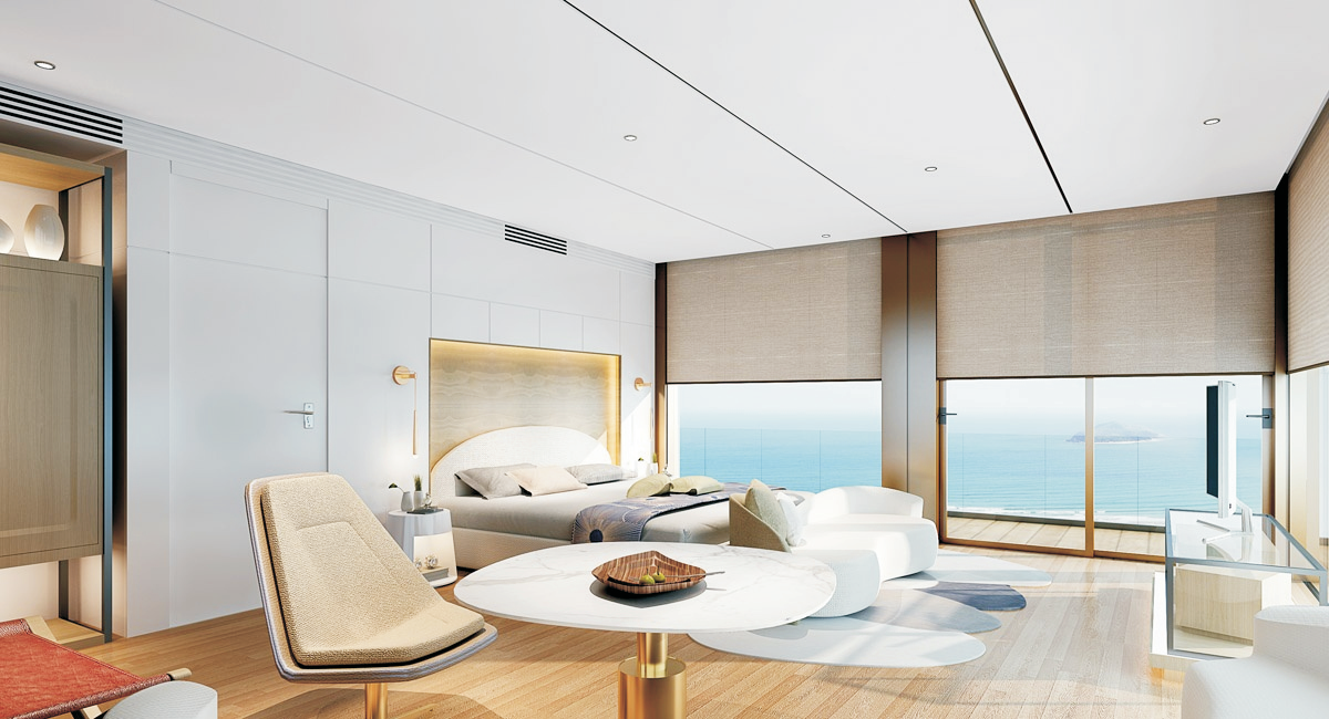 岶勞中集海上酒店項(xiàng)目為集裝箱式獨(dú)立建筑,漂浮在海面上,客房散落在海洋上眾多又美麗,可組合成不同的形狀,美得純粹而原生態(tài),宅在房間里就能欣賞到360一線海景,獨(dú)一無二的眾多海底奇觀。在空間中形態(tài)中,“線”與“形”的元素貫穿場(chǎng)域,流線型幾何塊面的組合貫穿于整個(gè)酒店的設(shè)計(jì)之中,讓酒店像金石一樣歷久彌新,亦象征這酒店百舸爭(zhēng)流、乘風(fēng)破浪、永攀新高的美好寓意。