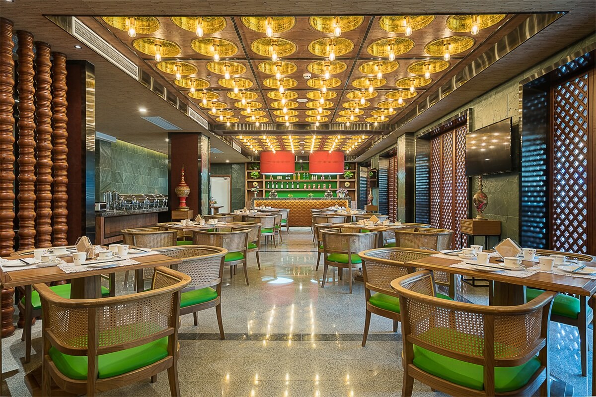 全日制餐廳,座椅選用泰式經典藤椅,和同色系的竹桌相結合,給人一種置身于林間木屋的感覺。天花吸頂燈采用金色燈罩,和大堂色彩搭配一致。餐廳兩側配有泰式陶瓷藝術擺件,在細致的地方體現泰式風格。餐具選用了簡潔古樸的白瓷,放在簡單的竹桌上,給人一種回歸自然、感受寧靜的感覺。。