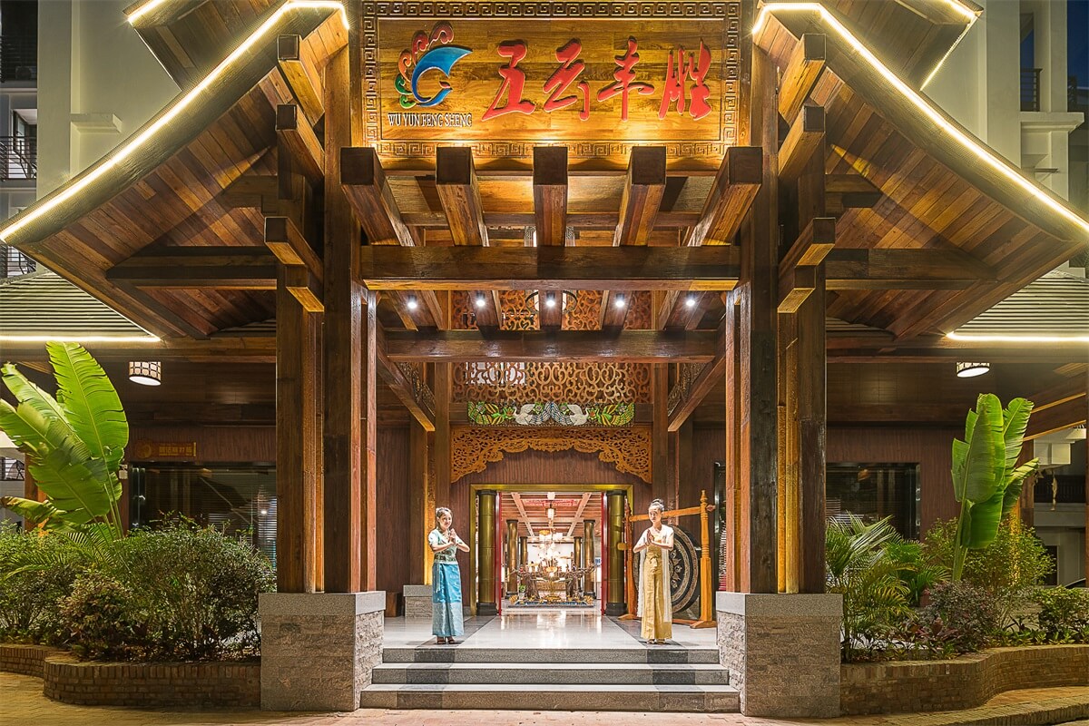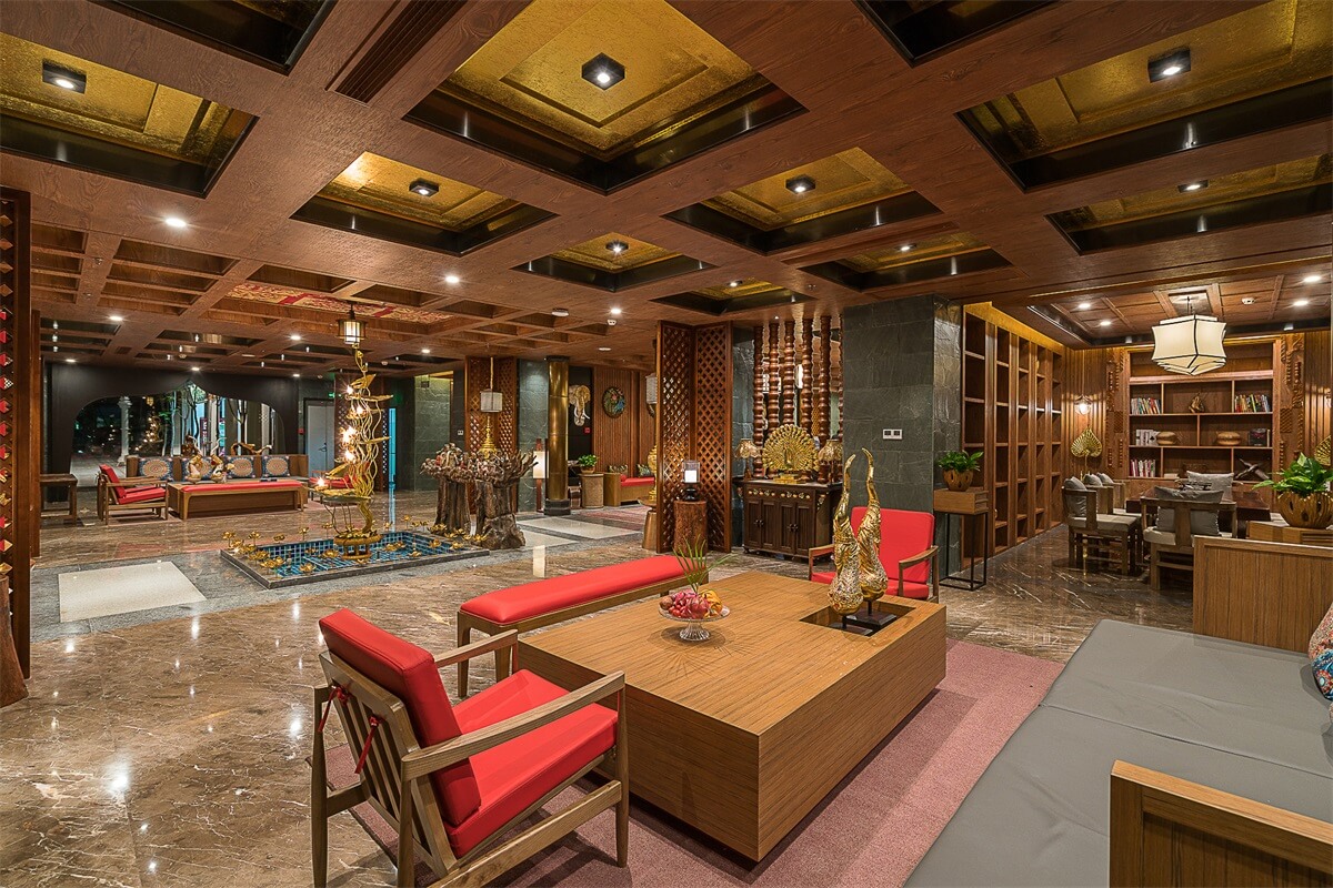 在大堂的設計上,整體以深褐色、金色、暗紅色為主,多選用實木材質和金色的金屬,整個空間既穩重,又能透出一種奢華之感。加上富有東南亞氣息的蓮花、孔雀及有佛教元素的擺件,使整個大堂也顯示出一種異域的神秘感。