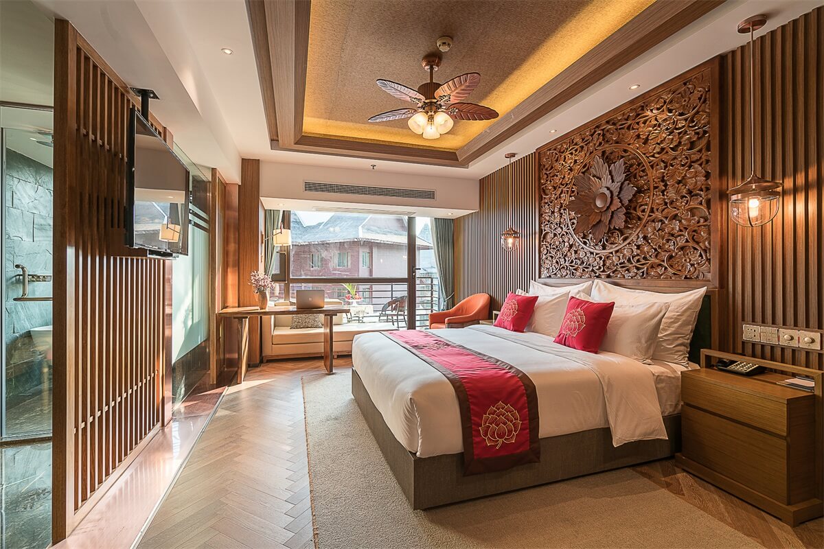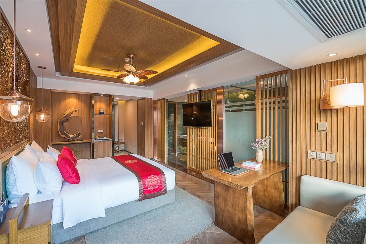 在電梯廳的設計上,紅色的天花、金色的墻體、金色的地毯,和整個酒店的泰式風格相輔相成,在邊幾上擺放富有泰式風情和佛教感覺的金色擺件,給人一種驚喜的感覺。在客房的設計上,地板、沙發、茶幾、屏風、吊燈、臺燈、背景墻等都采用木材作為原材料,地毯則選用淺色系,給人回歸自然的寧靜感。